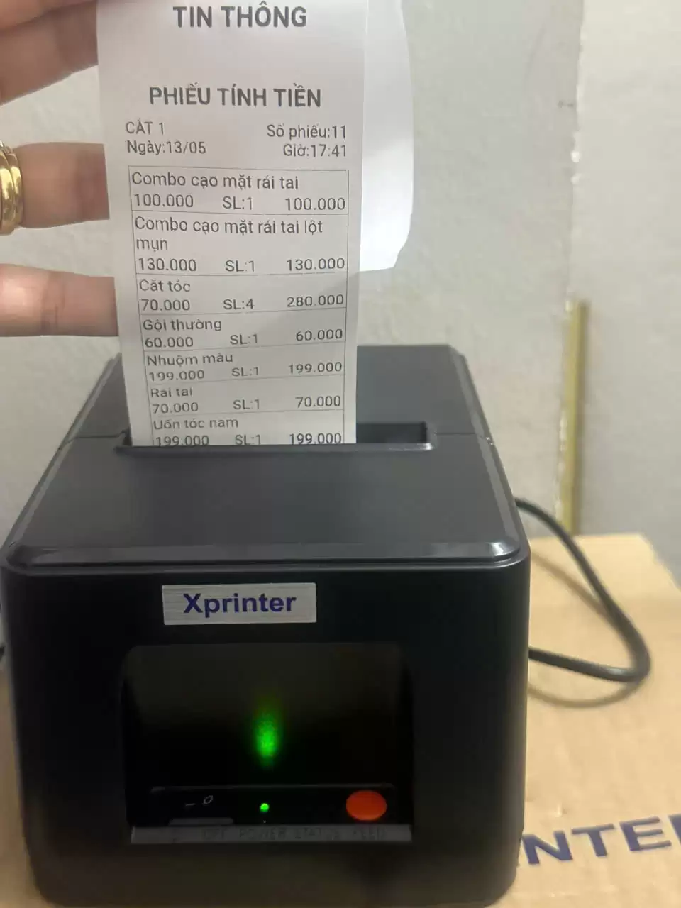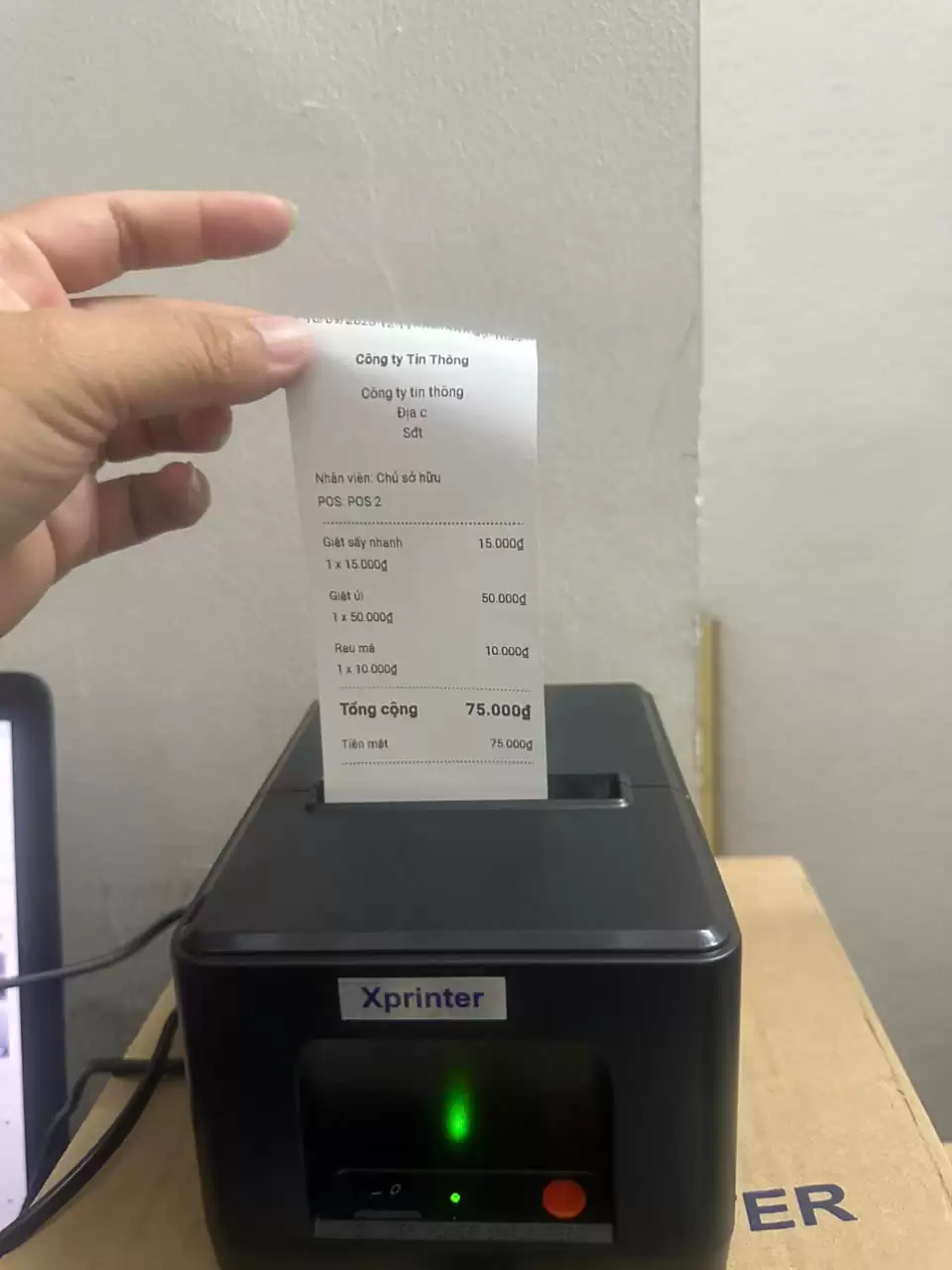 Máy tính: Kết nối USB → Cài driver (nếu cần) → Chọn máy in trong phần mềm → In bill.